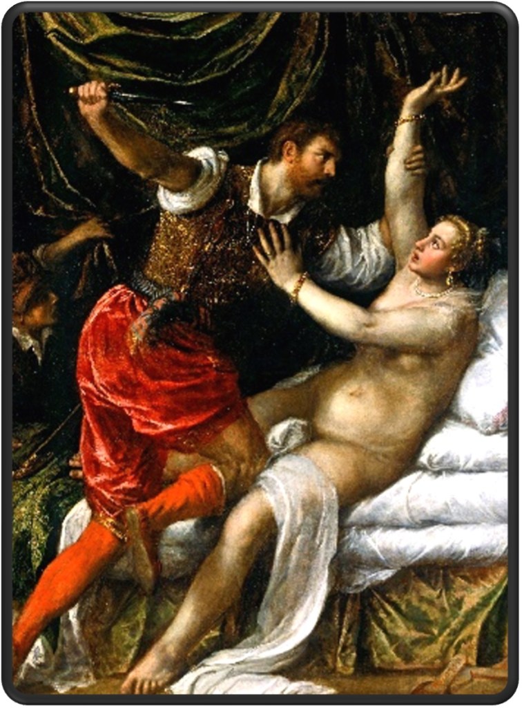 قرنها بعد، ویلیام شکسپیر هم تجاوز را موضوع داستان منظومی با نام"تجاوز به لوکریس[۸]" قرار داد. در گفتگویی دوستانه میان دو سرباز رومی، کلاتین[۹] از زیبایی و وقار همسرخویش برای تارکوئین[۱۰] سخن میگوید. تارکوئین به شهر میرود و به خانهی کلاتین. لوکریس (همسر کلاتین) از او پذیرایی میکند و تارکوئین از رشادتهای شوهر او در میدان نبرد داستانهایی میگوید. شب را همانجا میماند. خیال و هوس اما رهایش نمیکند، به خوابگاه لوکریس میرود و در برابر مقاومتش دست به دشنه میبرد.