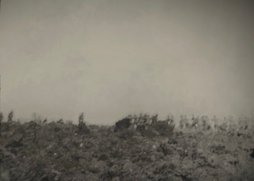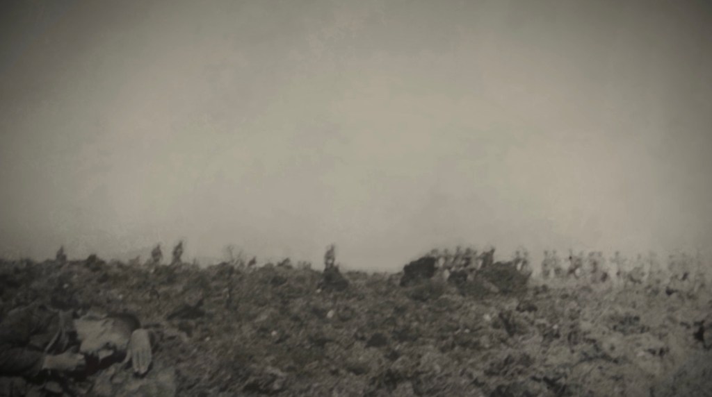یک عکس در آن میان اما، داستان عجیبی دارد. هکنی در یکی از دشوارترین و پرتلفاتترین نبردهای جنگ (مشهور به نبرد سُم somme، جایی در شمال فرانسه) که سالها به عنوان فاجعهبارترین روزِ تاریخ ارتش بریتانیا شناخته شد، در لحظهای کممانند عکسی شکار میکند از پهنهی مرگبارِ دشتِ تیره پس از ساعتها کشتار. در افق، اُسرایی آلمانی خود را به نیروهای بریتانیایی تسلیم میکنند. در گوشهی سمت چپِ قاب تصویر، جوان کم سنوسالِ آلمانی، تمثالِ بیبدیل و غمبار مرگ است. تصویرِ تباهِ پوچیِ جنگ. تراژدی.